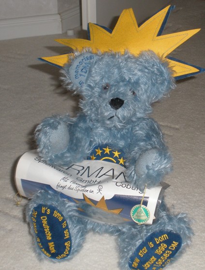 Im Ohr des Bären ist ein 1DM Stück fest eingenäht.